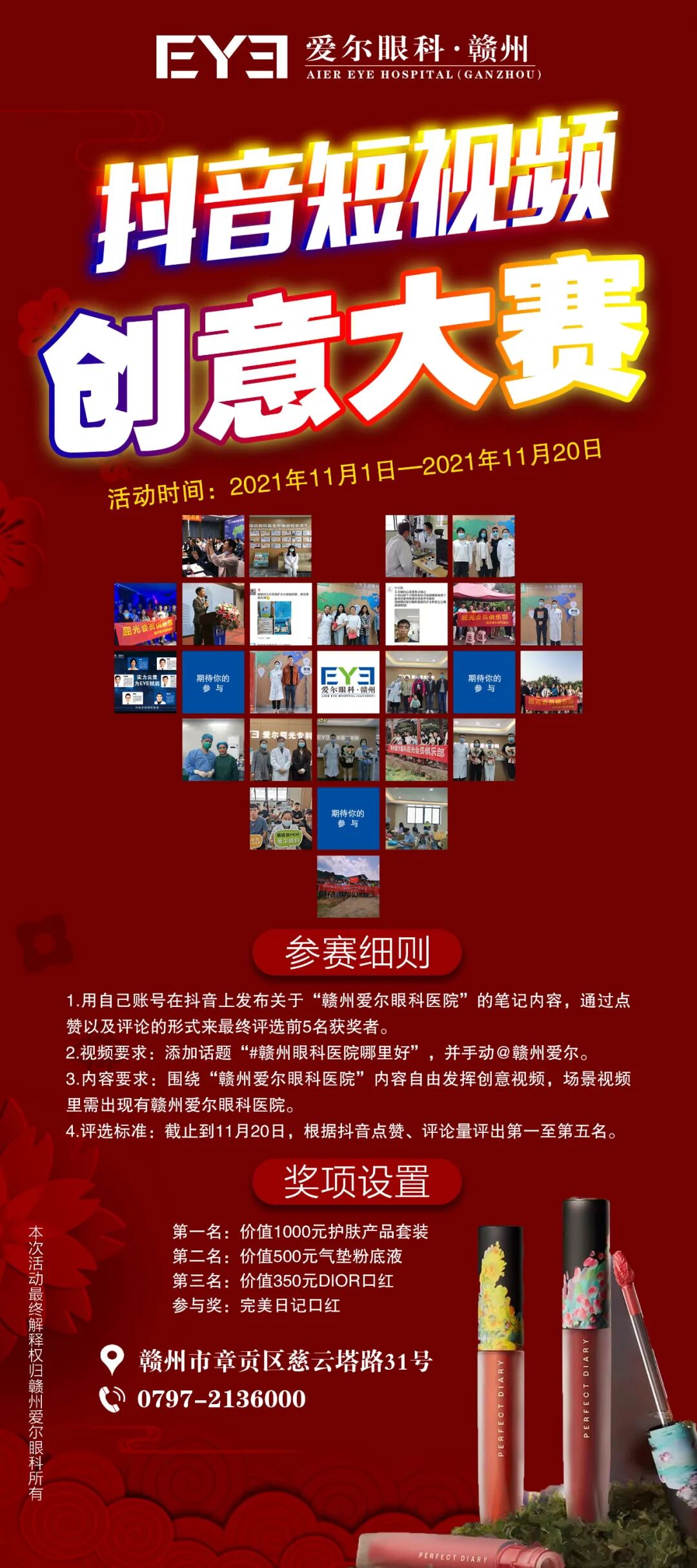 ①参与形式:用自己账号在抖音上发布关于“赣州爱尔眼科医院”的视频内容,通过点赞以及评论的形式来最终评选前3名获奖者。